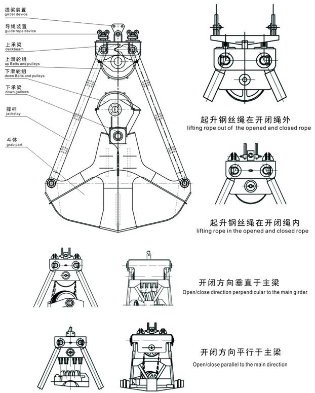 У всіх типах кранів з двома групами двигунів durm (моторна підйомна машина) кожна група двигуна durm веде дві тросові канати, вони роблять одне групове трос з корінням у рамці балансу для підтримки, інша група тросів пропускає шків між собою та пучок пучка, комбінований шків, як відкритий і закритий ковш.